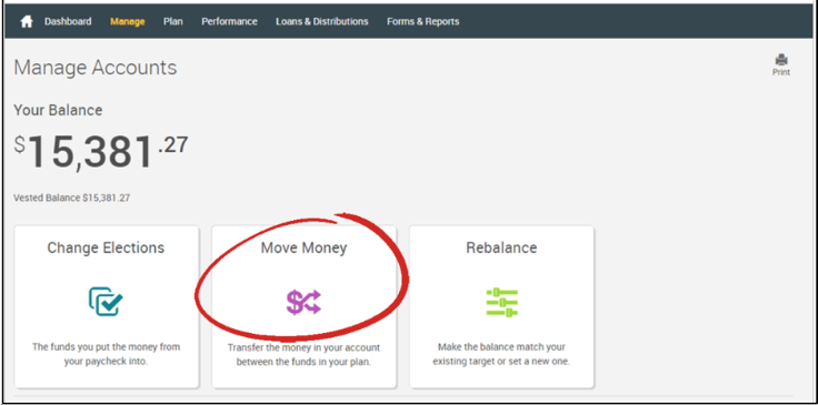 You can move the funds in your retirement account to new investments without changing your investment elections online at any time using HowardSimon Retirement Portal. Once you have logged in:
