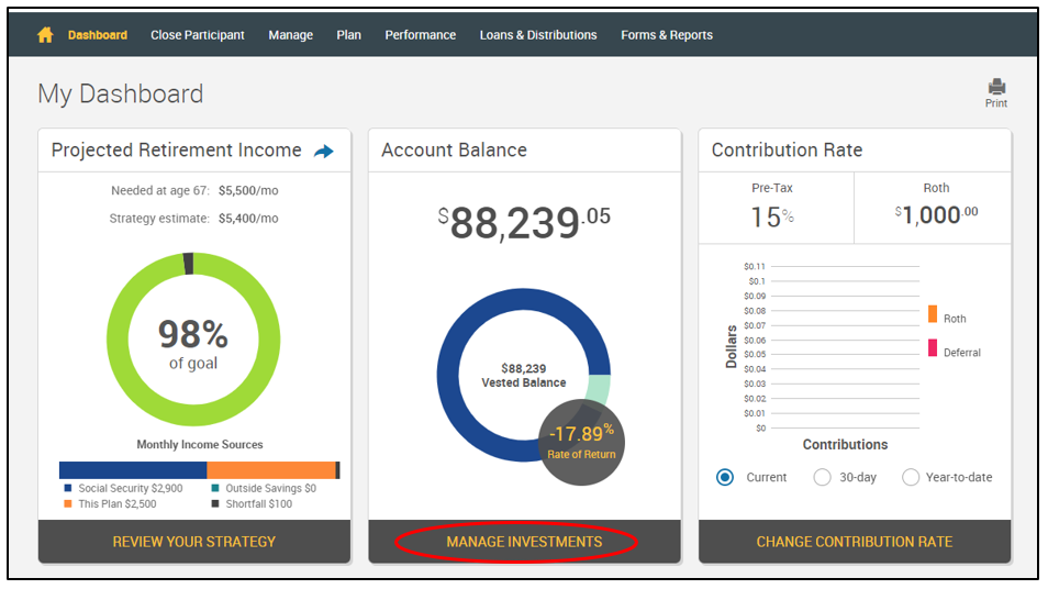 From My Dashboard, Select Manage Investments in the Account Balance box.