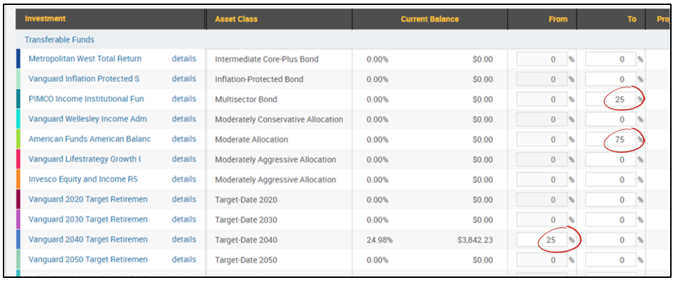 Find the fund you would like to move funds from and enter the percent you would like to move (e.g. 25%) in the From column. Enter the percent you would like to have allocated to each fund in the To column. Note this should total 100%.