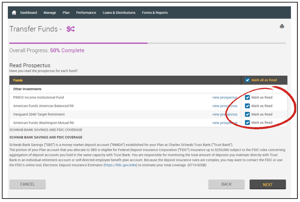 Next, confirm you have read the prospectus for the funds that you are moving. Select Mark as Read and then choose Next.