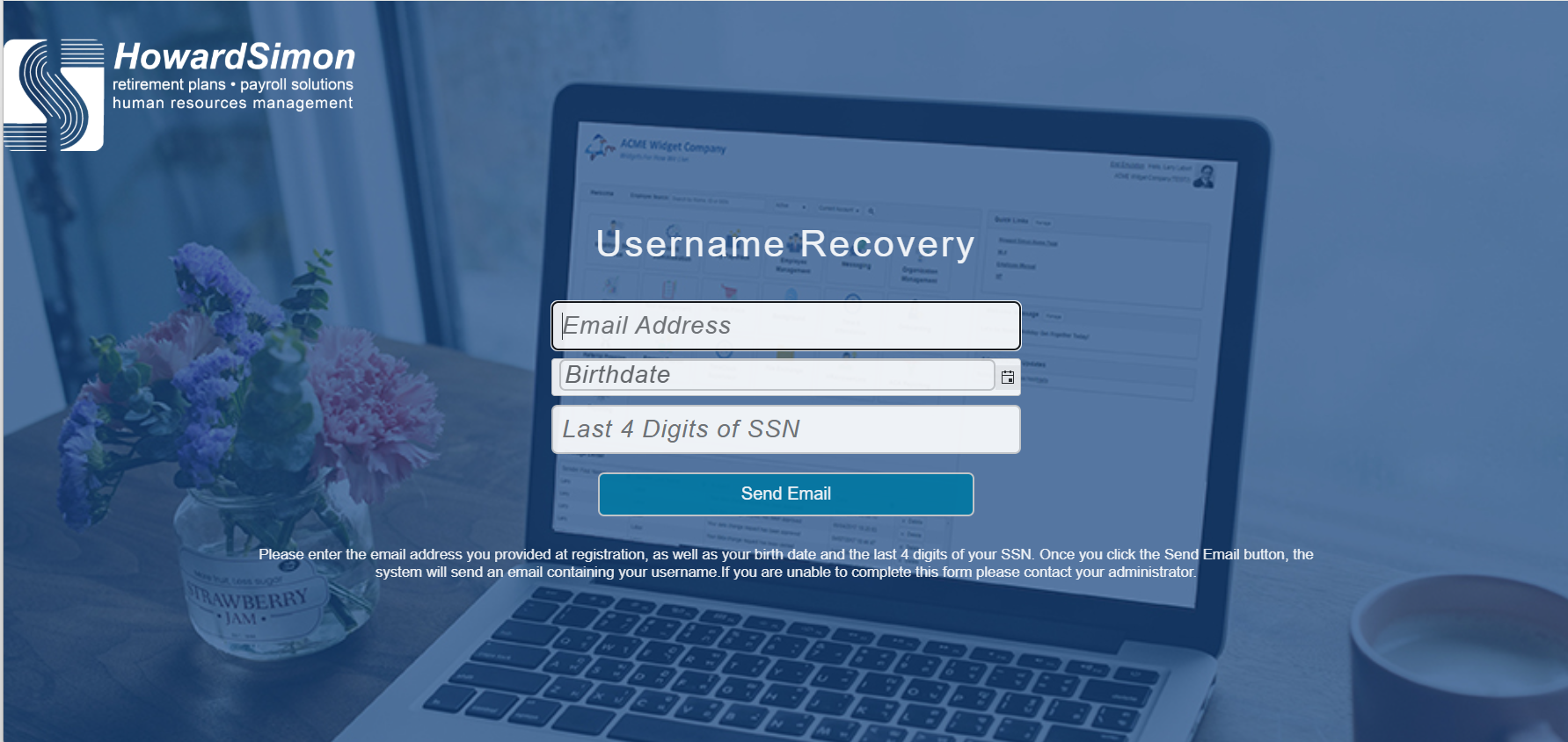 On the Username Recovery screen, enter the Email Address you provided at registration, your Birthdate, and the Last 4 digits of SSN (Social Security Number). Then click the blue Send Email button. The system will send an email containing your username. If you are unable to complete this form please call us at (800) 424-7526 or send an email to retire@howardsimon.com.