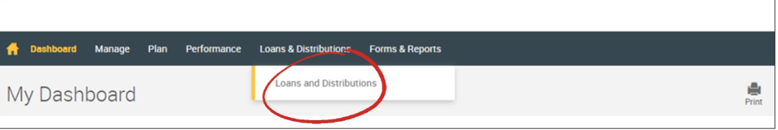 To initiate your online distribution request from your participant dashboard, choose the Loans and Distributions menu.
