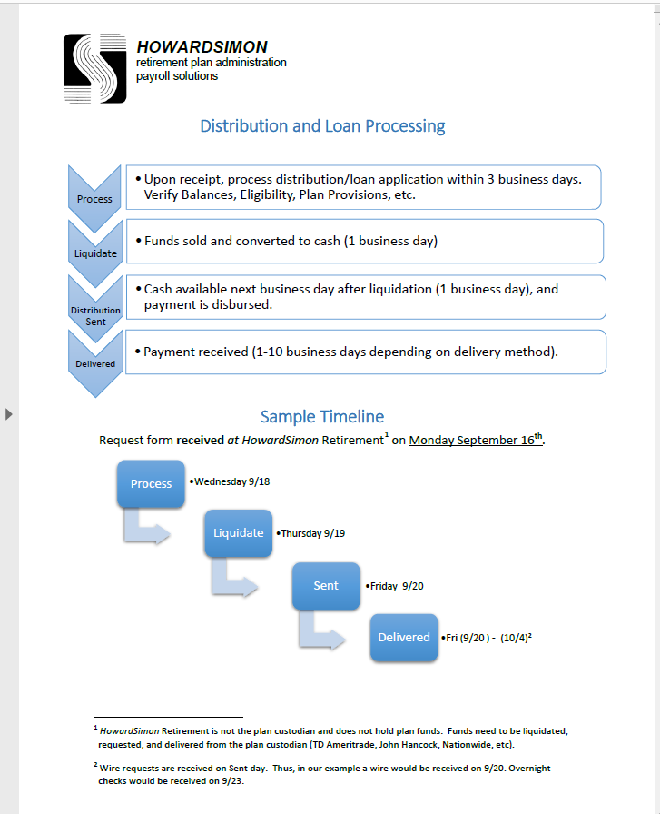 Once all information is received and Plan Sponsor approval has been obtained, we begin processing the request. Our processing time is 5-7 business days.